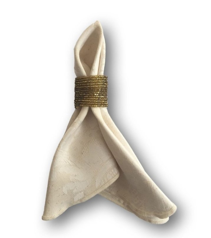 Guardanapo em tecido Jacquard bege medindo 40cm x 40cm.